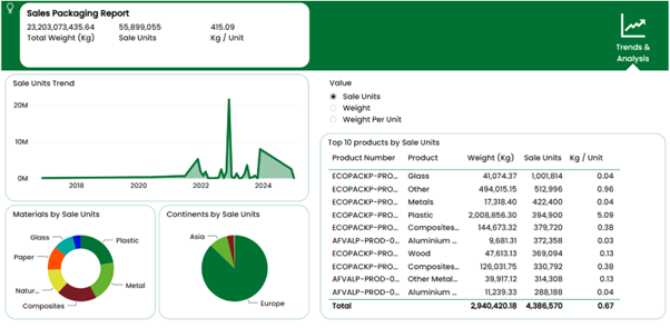 Packaging Analysis – shows the Total Weight of Packaging, Sale Units & Weight per Unit, split by Material & Continent, with a monthly trend and Top 10 Product list.
